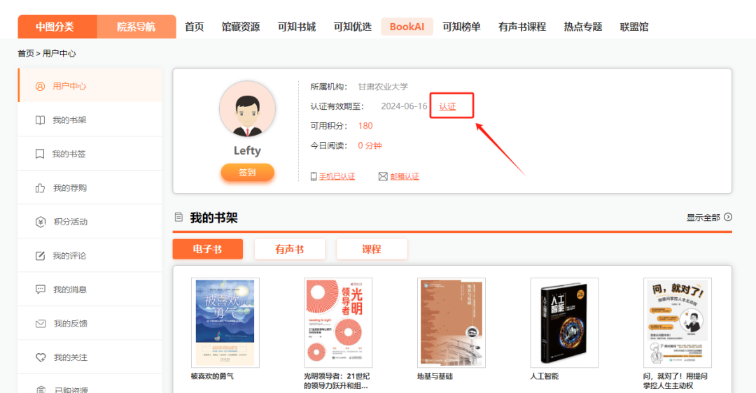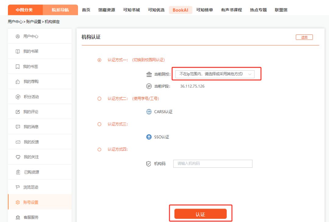 在校园网环境下,登录个人账号,点击网页左上角用户名进入“用户中心”,点击“认证”,选择“认证方式一”,即可实现“IP认证”。用户IP认证后,每次享有最长90天的离校访问权限。