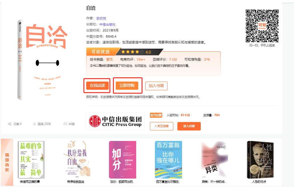 在查找到想要的资源后,可点击图书封面进入图书详情进行试读和荐购。