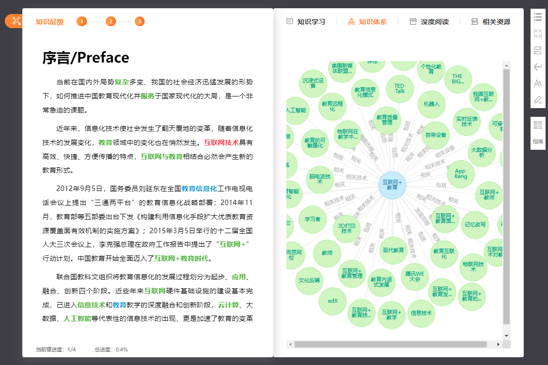 知识阅读是一种阅读与知识体系完美融合的阅读方式。可知平台实现了部分图书知识阅读模式,通过对知识点挖掘、知识体系构建、信息分析,在细分领域内实现知识点体系化,根据知识点关联各种类型资源,供读者进行网络化、体系化阅读。让读者在阅读一本电子书时,既可以学习与之相关的知识点解释,还可以根据知识体系的指引快速获取关联知识内容和资源进行系统性连贯学习。